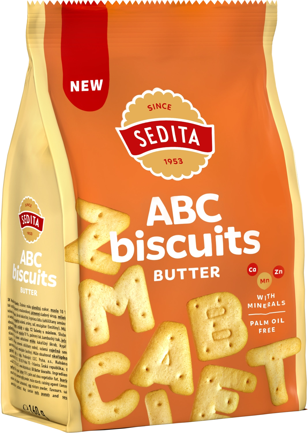 Maslové sušienky v tvare abecedy s vápnikom, zinkom a mangánom – minerálnym mixom na podporu rastu a vývoja detí. Upečené bez palmového oleja a umelých farbív