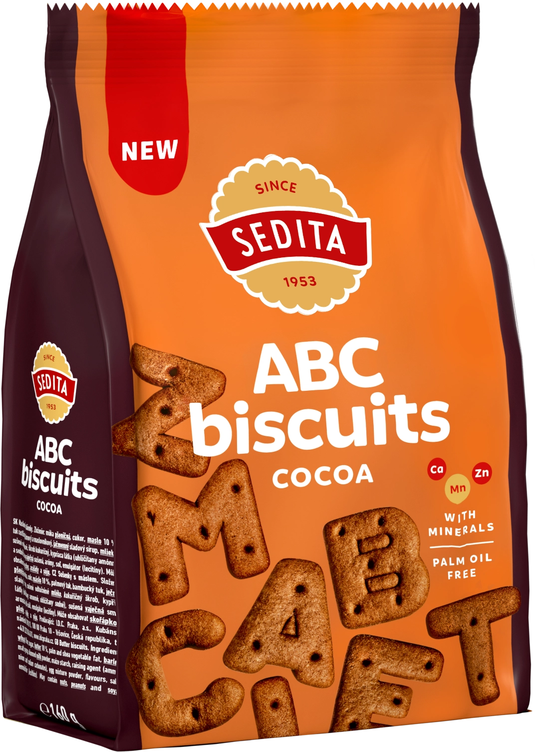 Kakaové sušienky v tvare abecedy s vápnikom, zinkom a mangánom – minerálnym mixom na podporu rastu a vývoja detí. Upečené bez palmového oleja a umelých farbív
